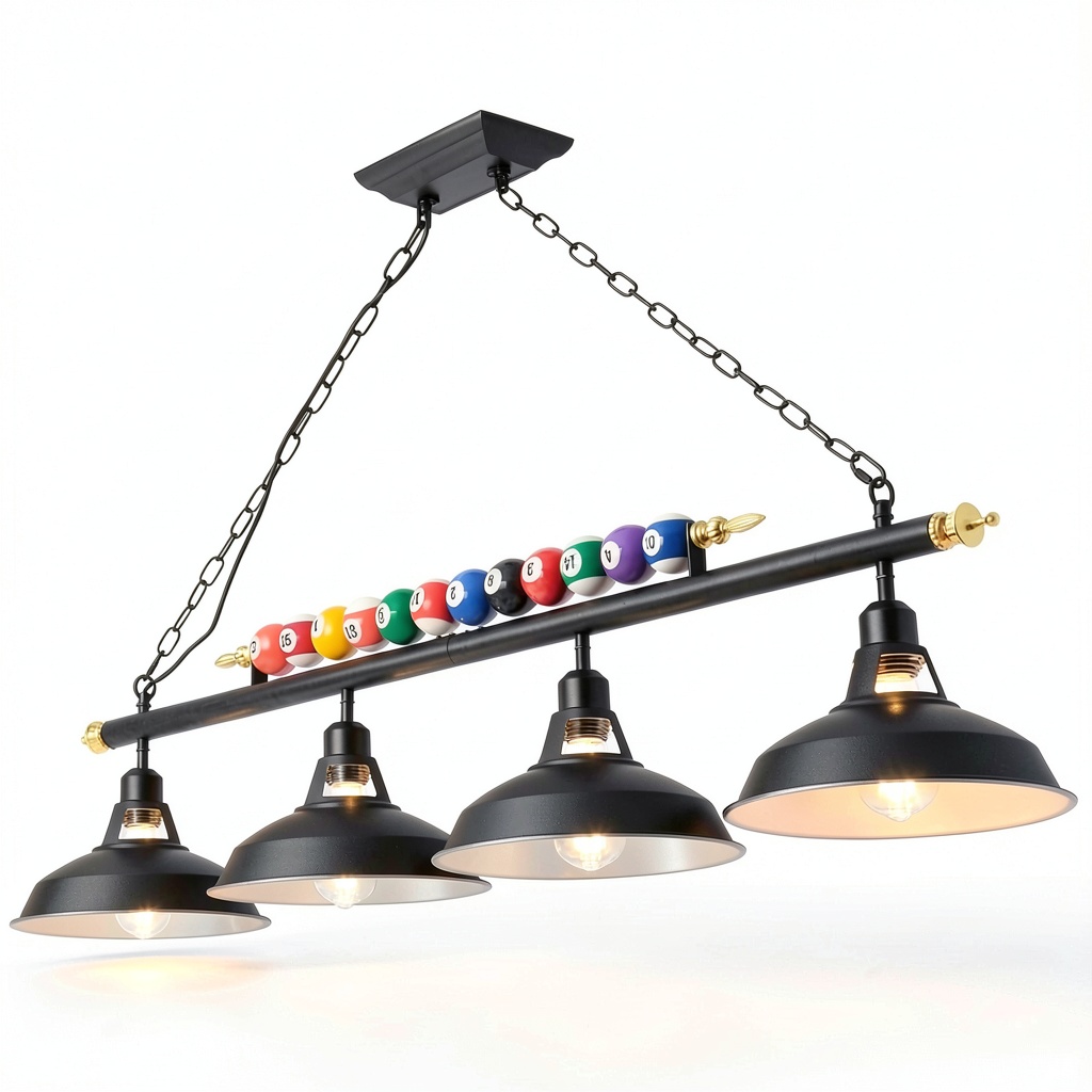 This modern black billiard table light is crafted from durable metal with a matte finish, ensuring longevity and a sleek appearance. It features a chandelier design with 4 light sources, each supporting up to 60W LED, incandescent, or fluorescent bulbs (bulbs not included). The fixture measures 50 inches in length, 10.7 inches in width, and 45 inches in height, and includes a pull-chain switch for easy control. With a warm white light color and 300 lumens brightness, it provides optimal illumination for focused activities. The semi-flush ceiling mount and adjustable chain allow for straightforward installation in various room settings.