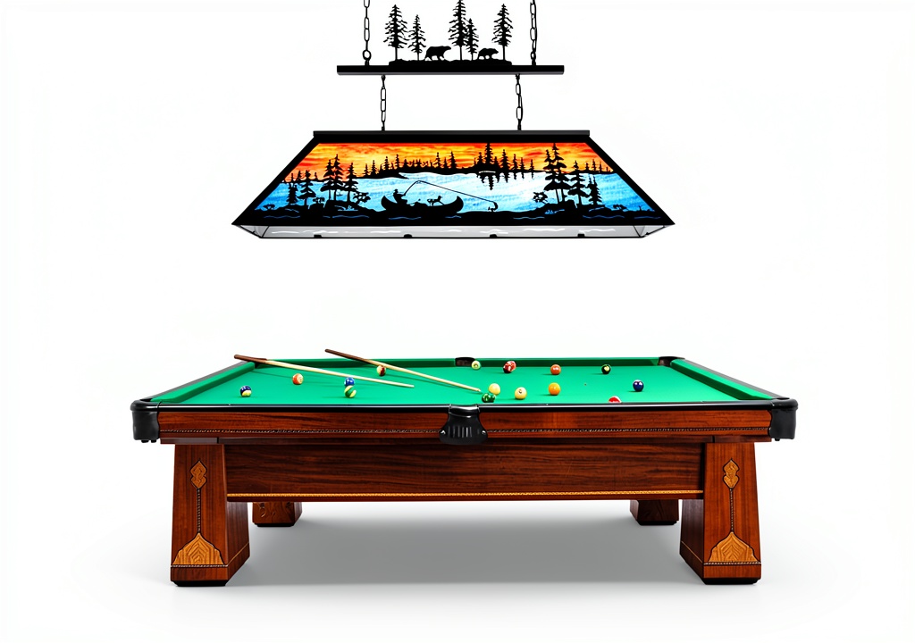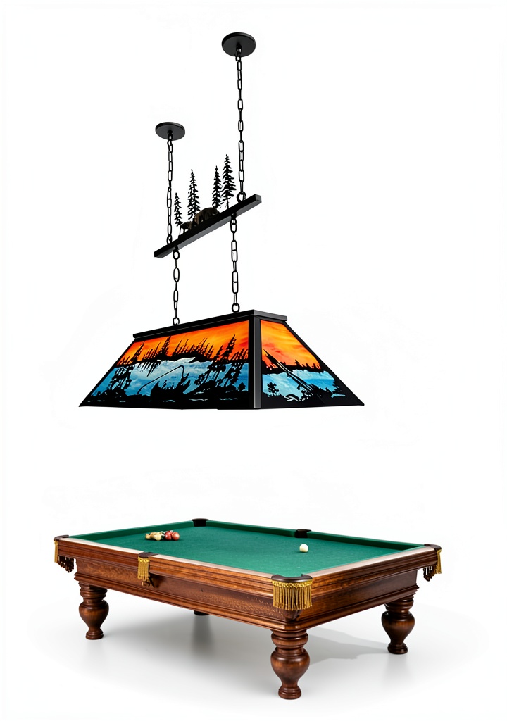 Enhance your billiard room with the Tochic billiard pool table light, a vintage-style chandelier that captures the tranquility of trout fishing under an amber sunset and blue lake. Measuring 47.44 inches long, 18.43 inches wide, and 32.62 inches high, this sturdy lamp weighs 32.4 pounds and features two 43.3-inch adjustable chains for flexible hanging over 7 to 8-foot pool tables. It accommodates up to six E26 base bulbs (max 60W each), compatible with incandescent, Edison, CFL, or LED options, and supports dimmer switches for customizable brightness. Crafted for durability, it includes all necessary mounting hardware and detailed instructions, though hardwiring is required as it lacks an outlet plug.