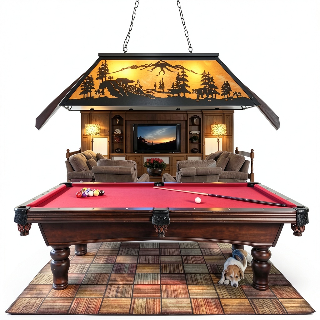 The Tochic rustic billiard light showcases a majestic bear fishing in the woods, paired with an amber acrylic sheet shade that mimics the rising sun in a forest, bringing a natural cabin aesthetic to any space. Crafted with durable materials, this professional billiard table light measures 43.3 inches long, 18.5 inches wide, and 16.2 inches high, with an adjustable 43.3-inch metal chain designed specifically for 7-9 ft billiard tables. It features three E26 bulb bases supporting up to 60W each, compatible with LED, CFL, or Edison bulbs (not included), and offers full dimming capabilities when used with dimmable bulbs and switches. Weighing 28 pounds, it includes all necessary mounting hardware for straightforward setup, ensuring reliable performance in various environments.