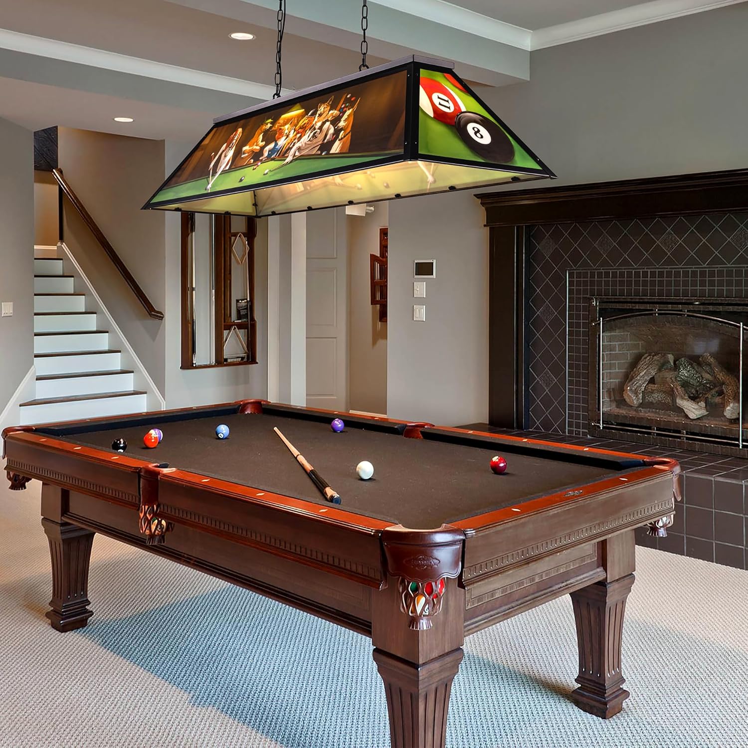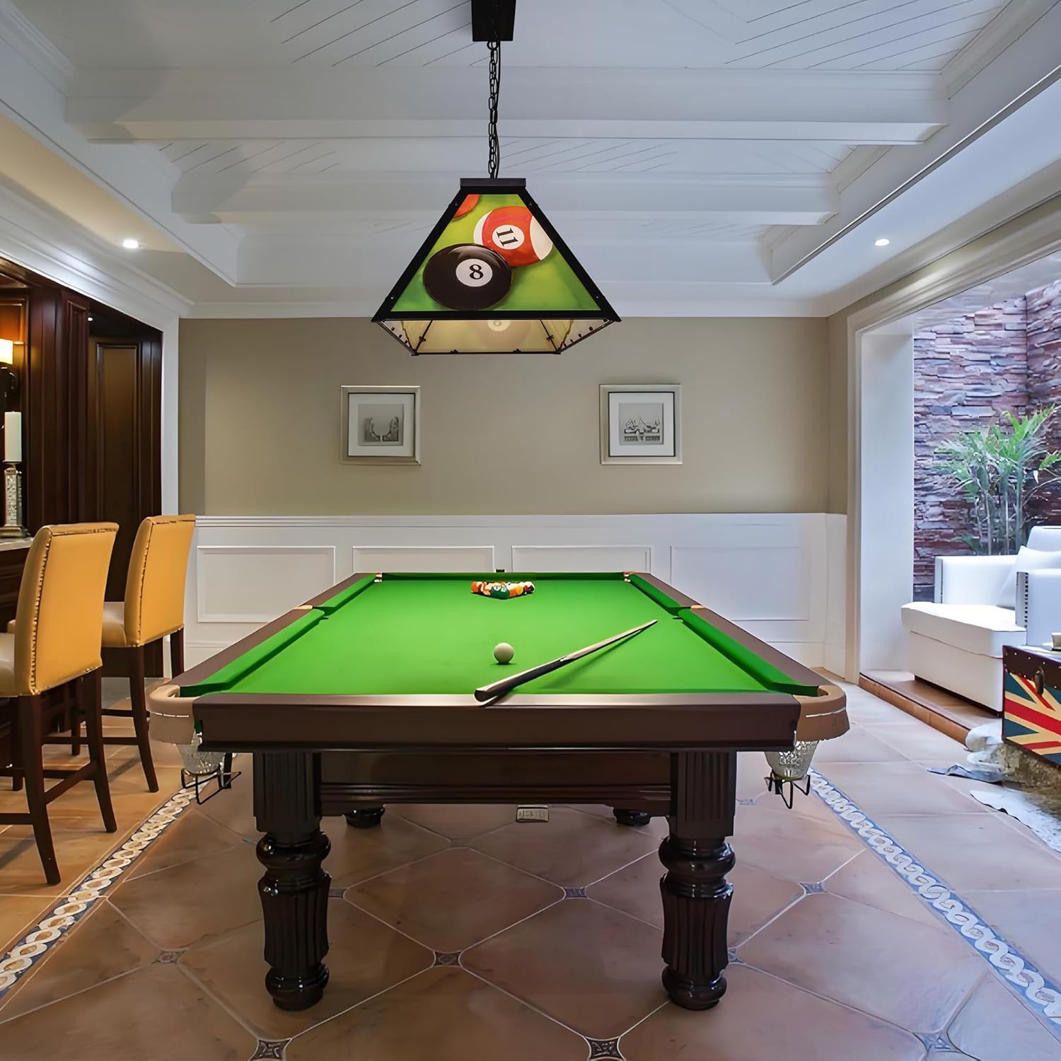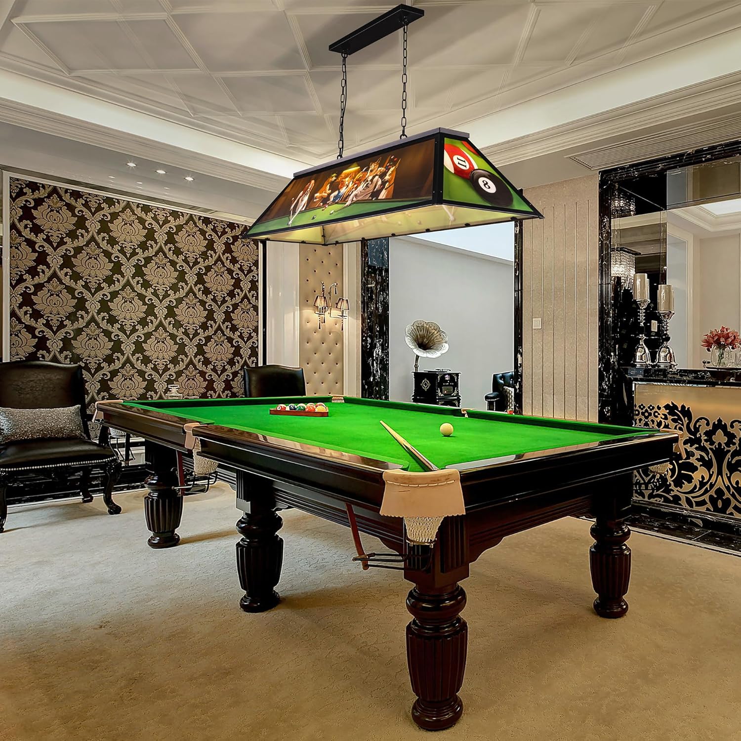 This pool table light is perfect for game rooms, bars, kitchen islands, and dining areas, providing focused lighting for 7 to 9-foot pool tables while creating an inviting atmosphere. Its contemporary, modern, farmhouse, and Tiffany styles appeal to homeowners and business owners seeking to blend functionality with decorative charm. The adjustable chain and easy assembly make it suitable for flat, sloped, or slanted ceilings, ensuring optimal positioning for gameplay or social gatherings.